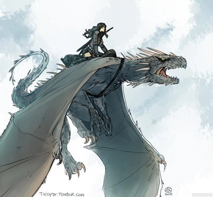 The image depicts an illustration of a girl riding on the back of a fantasy-style dragon. The girl has