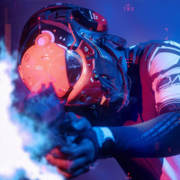 futuristic helmet and suit with orange accents. They are holding a gun in one hand, pointing it towards something out of the frame, and there's a bright