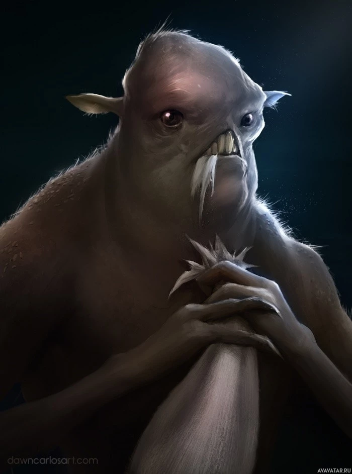 a humanoid form, and it has a somewhat furry appearance with a mix of brown and white hues. The creature's expression is somewhat menacing or aggressive due to its