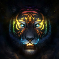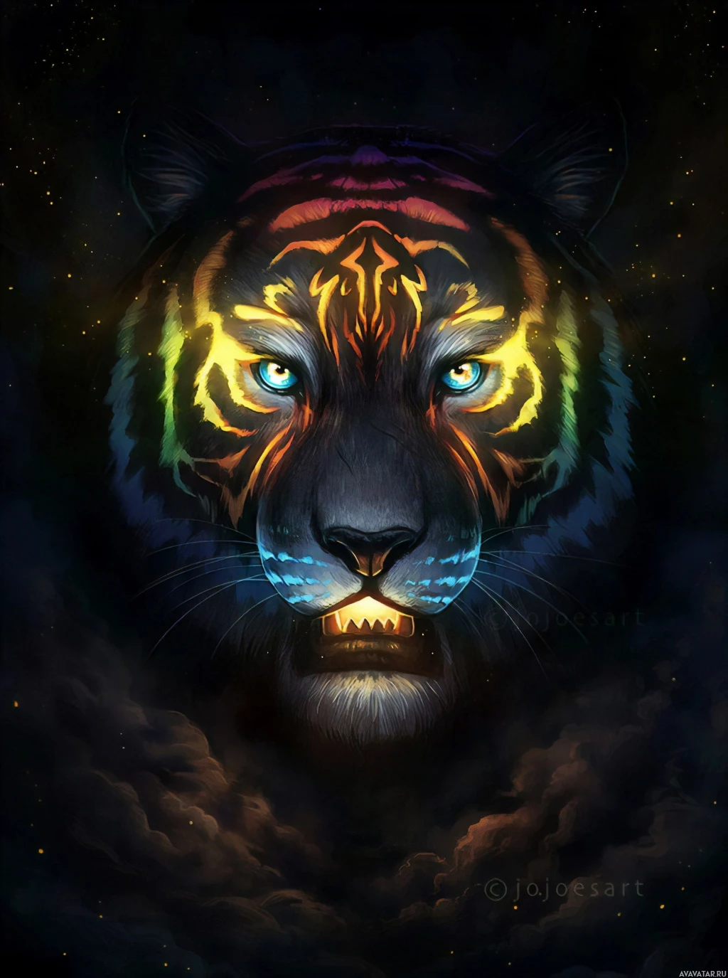 vibrant colors, including blues, purples, yellows, and reds, which highlight the fiery and intense look of the animal. The background features darker shades of blue and black, suggesting