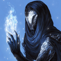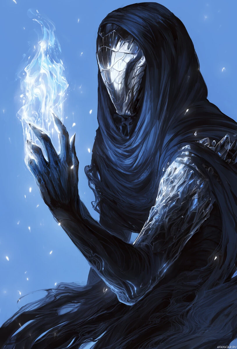 eerie presence. In one hand, the character is holding what appears to be an ethereal blue flame or energy, emitting sparks that resemble magical or