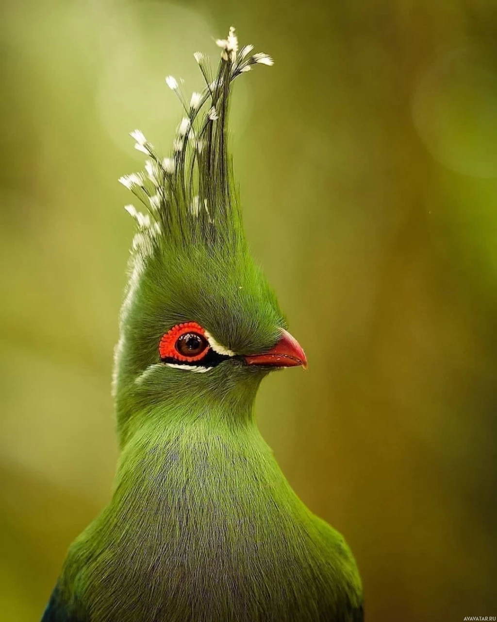 red patch on the throat. It also features a mane-like tuft of feathers on top of its head that are white and black, giving it a unique "mohawk" look. This bird's appearance suggests that it may be a species like the Turaco, known for their