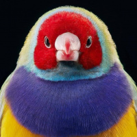a colorful bird with a prominent red face and crest, a yellow body, blue wings, and a green back. This is likely a parrot due to