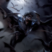 The image depicts a horror-themed scene featuring what appears to be a vampire or similar creature. The figure is surrounded by numerous bats that are flying towards it, which creates