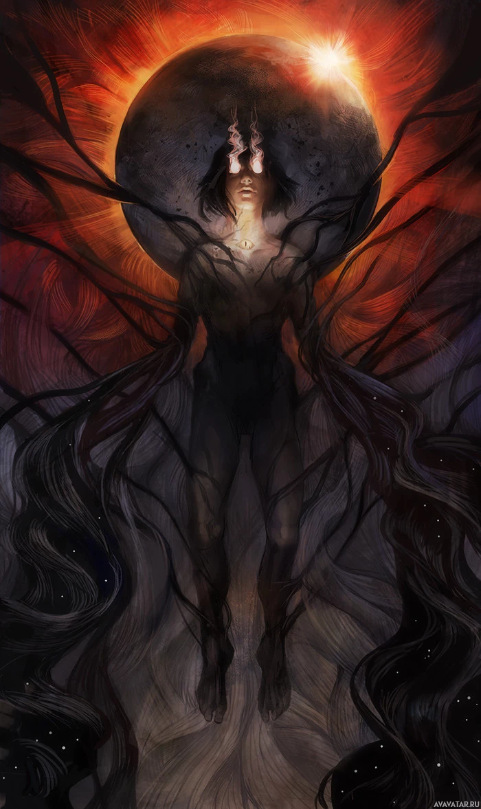 a dramatic sky with hues of orange and red, indicative of an eclipse or intense celestial event, which is often associated with mysticism or magical occurrences in fantasy narratives. The overall impression is one of a powerful,