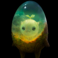 large eyes and is depicted sitting in the middle of the egg with its arms resting on its knees. The egg itself has a vibrant green interior that resembles water, complete with