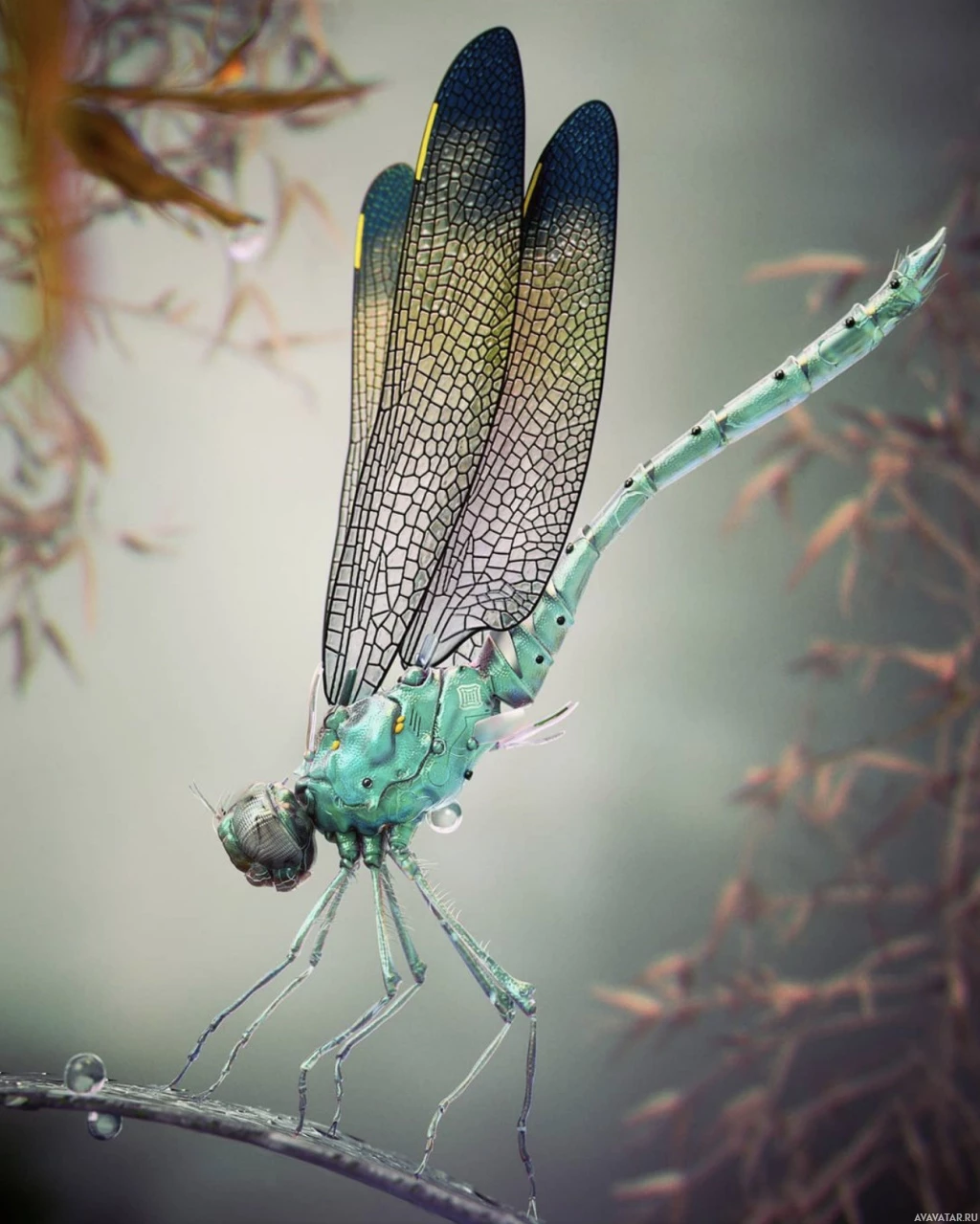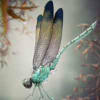 На этом снимке изображена стрекоза с голубыми и зелеными крыльями, сидящая на ветке. Кажется, что стрекоза находится в движении, передавая суть изящных движений природы. Фон мягко сфокусирован, выделяя стрекозу в качестве центрального объекта.