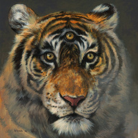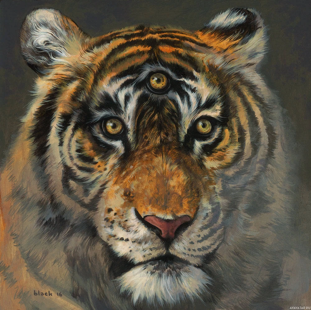 The image shows a tiger with a unique depiction. Its face features are exaggerated for