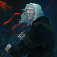 a fishing rod into water, possibly preparing to fish or control the presence of red creatures that resemble frogs in the water around him. The setting is dark and moody, suggesting an underwater or magical environment where the usual rules might not apply. The man's attire and the style of the artwork suggest a medieval or fantasy theme.