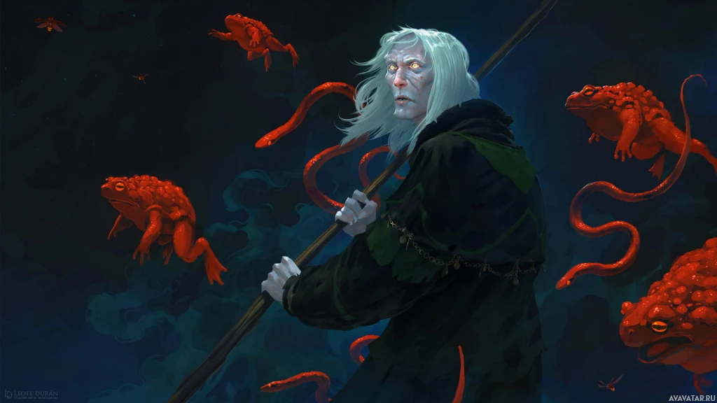 a fantasy scene with a man standing in the foreground. He appears to be casting