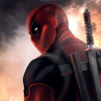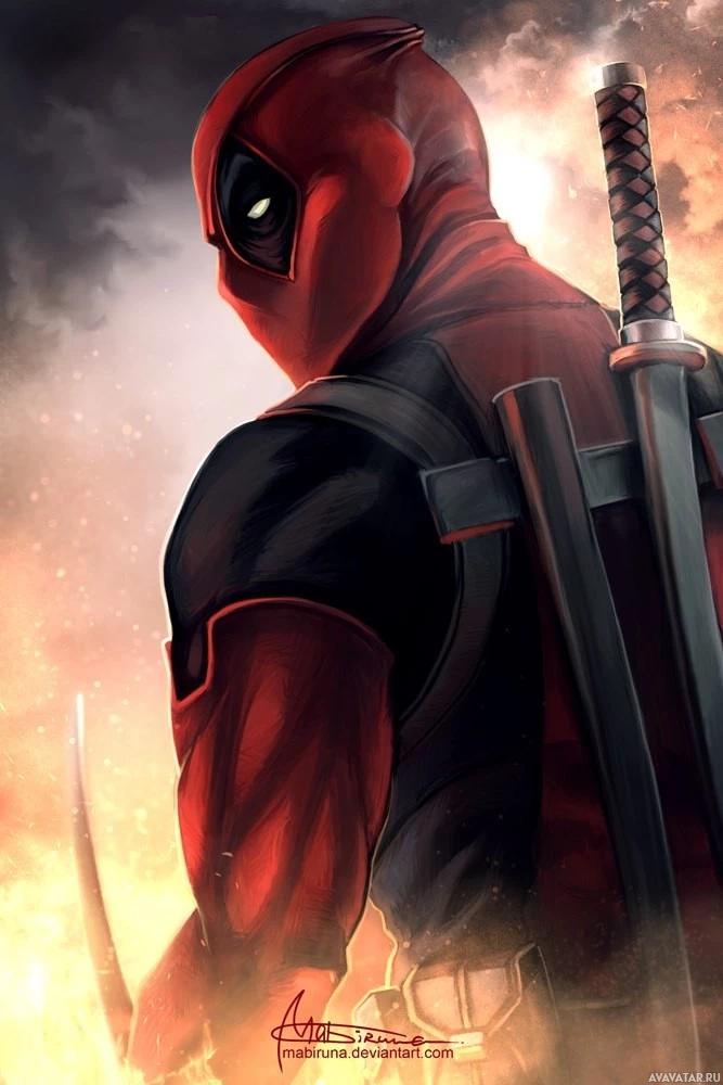 iconic costume which includes red and black body armor, with the name "Deadpool" written across the chest, and he's carrying dual katanas crossed over his back. The background has