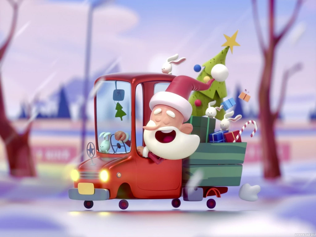 Santa Claus driving a sleigh pulled by a car, rather than the traditional reindeer. It is set in a winter landscape with snow on the ground and trees, which suggests that it might be around Christmas time or during