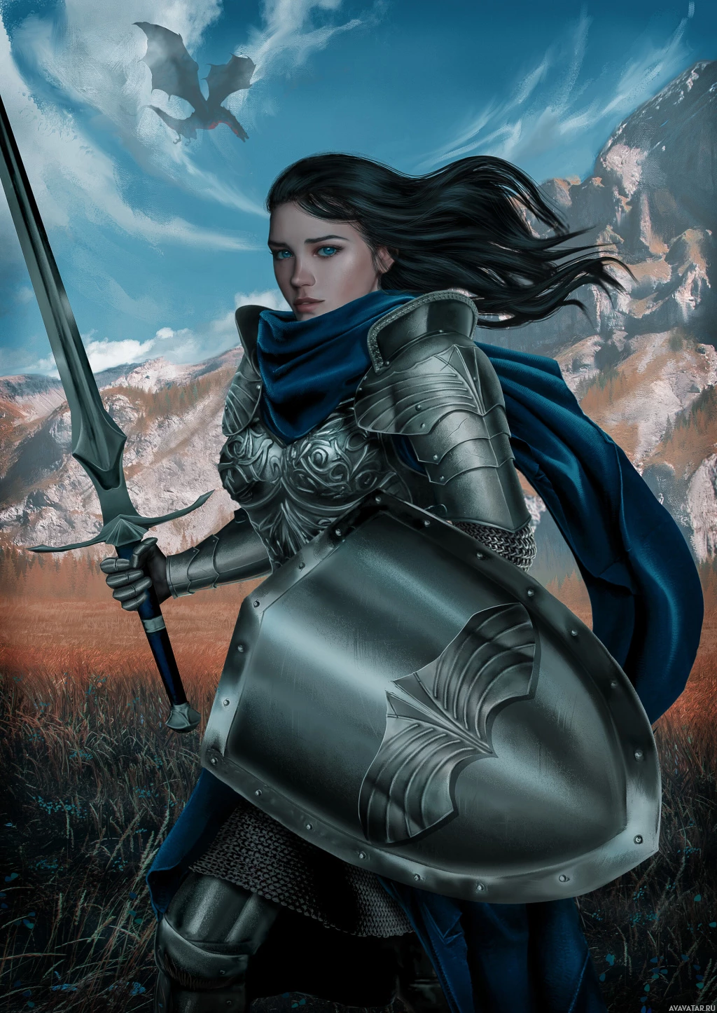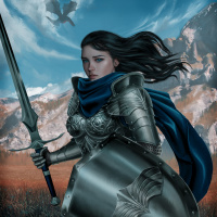 dark hair and is wearing armor that includes a chest plate and a helmet with a visor. In her right hand, she holds a sword with both hands, ready for combat. Her left hand grasps the hilt of another sword attached to her back, suggesting she carries
