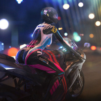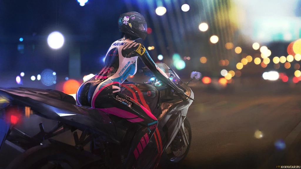 neon signs in the background. The rider is wearing a full-