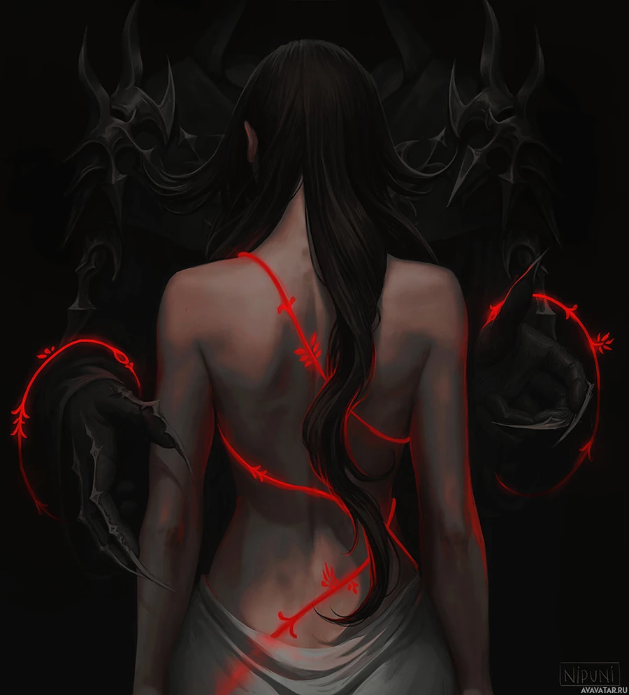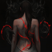 long hair, wearing what appears to be an ornate garment or robe. Her back is turned towards the viewer, and there are red and black lines or shapes that could represent energy, markings, or perhaps armor. In the background, there's a stylized dragon or