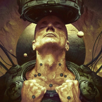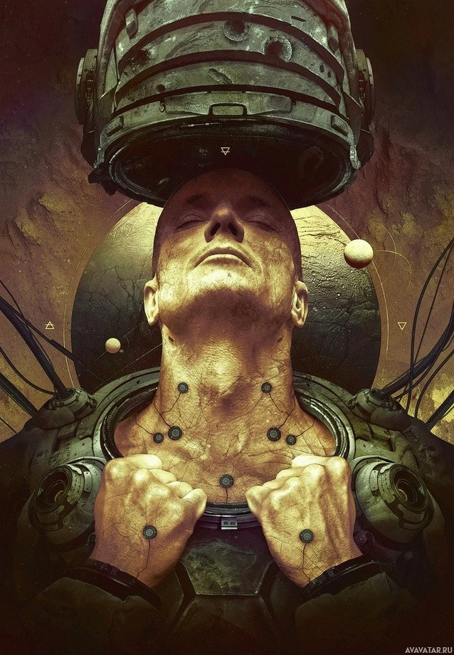 a serene expression on their face, as if they are experiencing a moment of enlightenment or realization related to the device or the technology around them. The artwork has a dark, industrial feel with a dominance of earth tones, which may suggest a theme of