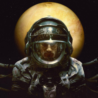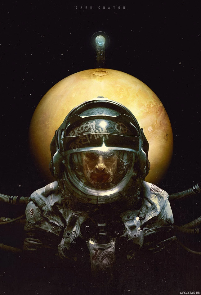 На картинке изображен человек в скафандре и шлеме, изображающий астронавта в космосе. На заднем плане изображены планеты, что наводит на мысль о космической или внеземной обстановке. Изображение выдержано в темных и угрюмых тонах, что может указывать на научно-фантастическую или драматическую тематику, связанную с исследованиями космоса или приключениями.
