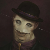 The image depicts a character wearing a top hat and has an unusual facial expression. This character appears to be a humanoid figure with a mask-like face, possibly representing a horror theme due to the exaggerated features that might suggest a sense of eeriness or unsettling atmosphere.