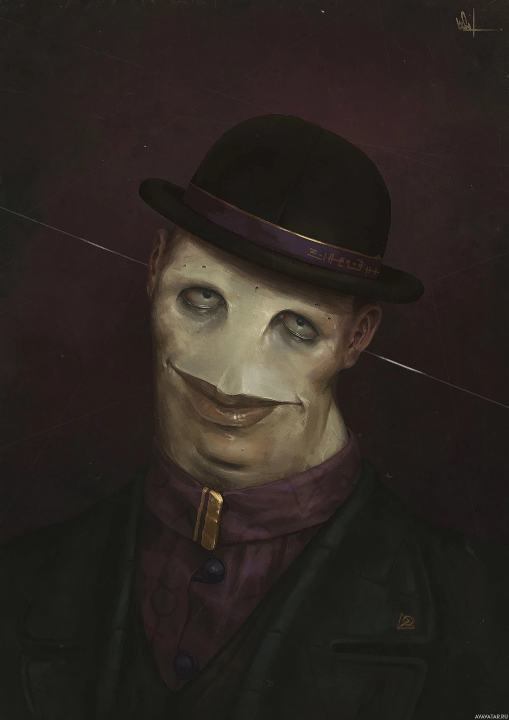 На картинке изображен персонаж в цилиндре и с необычным выражением лица. Этот персонаж выглядит как человекоподобная фигура с лицом, похожим на маску, возможно, представляющая тему хоррора из-за преувеличенных черт, которые могут создавать ощущение жуткости или тревожной атмосферы.