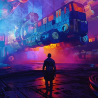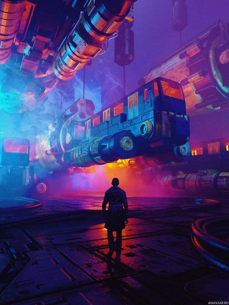 a sense of scale and wonder due to the large, floating industrial object that resembles an old-fashioned bus or locomotive, which seems out of place in this environment. The scene is bathed in a mix of purple and blue lighting, creating