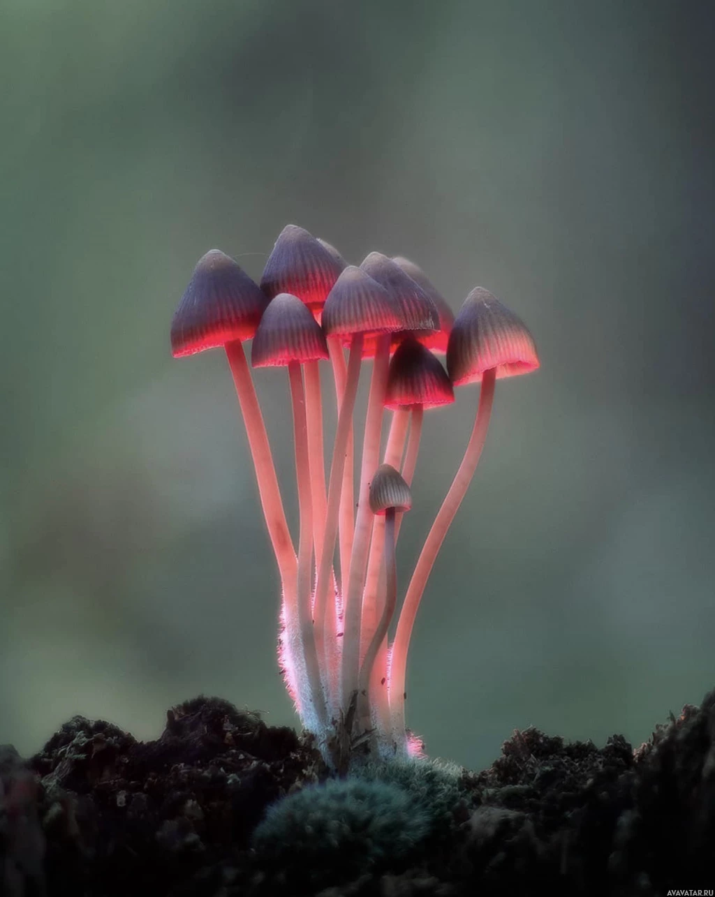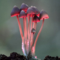 На картинке изображена группа грибов, растущих близко друг к другу, с подсвеченными красным и белым цветами. Кажется, что снимок сделан в лесу или редколесье при естественном освещении, которое подчеркивает яркие цвета грибов.