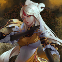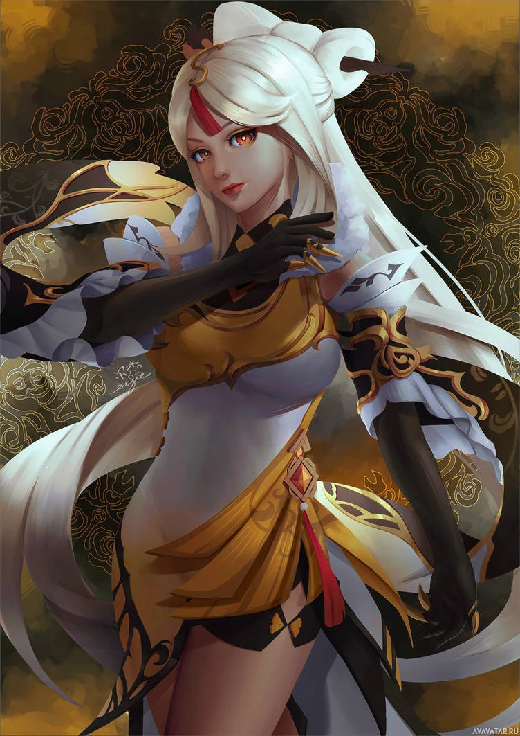 white hair. She is wearing traditional Asian-style armor, which suggests she might be a character from a fantasy or