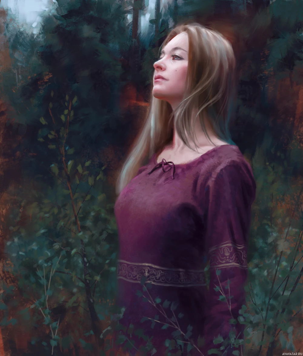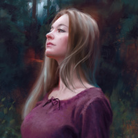 This is a painting of a woman in what appears to be a forest or woodland setting. She is looking away from the viewer, with her profile visible, and has blonde hair. The painting captures a moment of quiet reflection, as evidenced by her contemplative expression. The use of warm colors enhances the serene atmosphere of the scene.