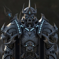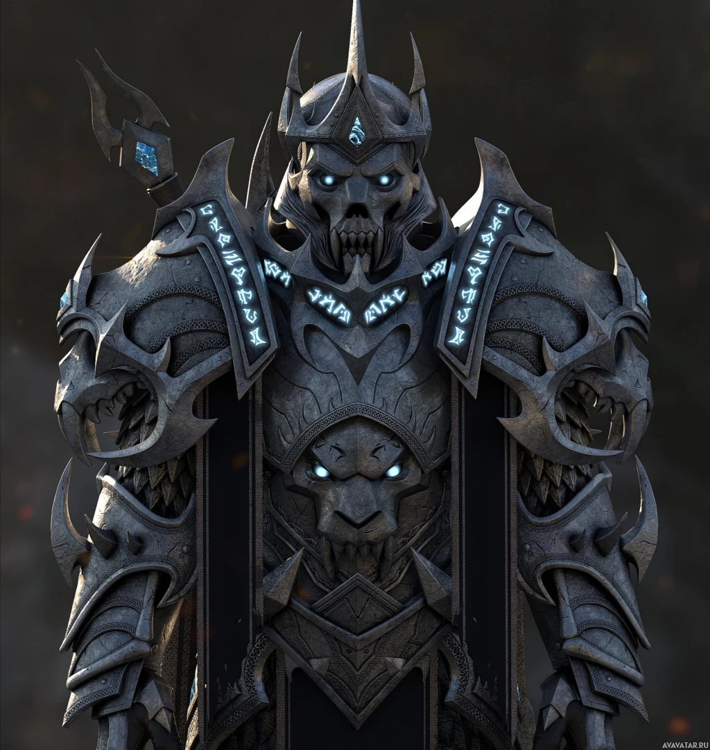 intricate designs on the armor and a cloak, which add to the overall impression of a powerful figure in a fantastical world. This could be an illustration from