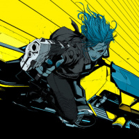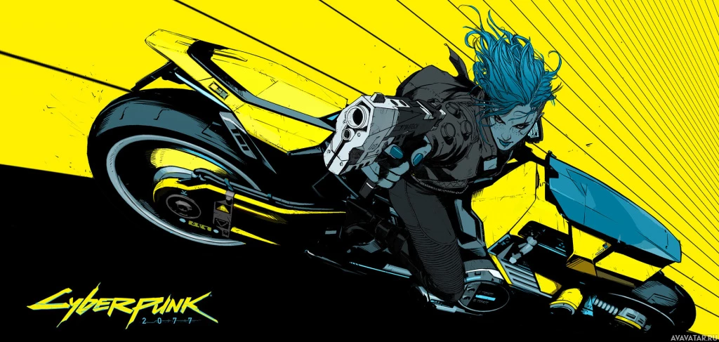 an animated character riding a motorcycle. The style suggests it could be from the game "Cyberpunk 2077." There is