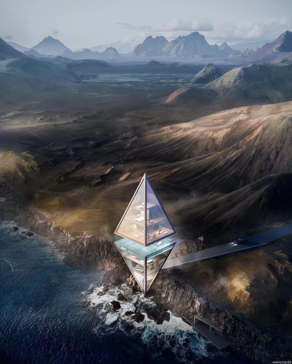 The image shows a futuristic, sci-fi landscape with a distinctive crystal