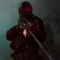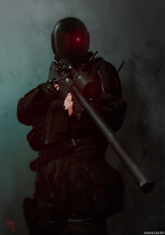 a protective helmet and holding a weapon. This could be interpreted as an individual dressed in