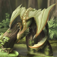 a fantasy scene featuring a dragon and a frog. The dragon has scales that resemble a mix of green and yellow, and its head appears to be serpentine with