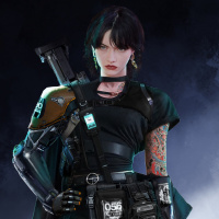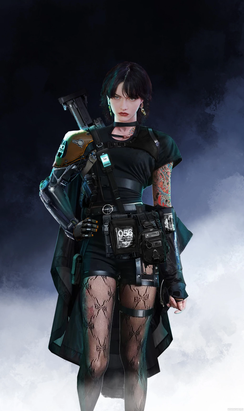 dystopian world. The character's attire and accessories indicate that she might be a warrior or a soldier in this context.