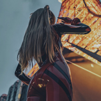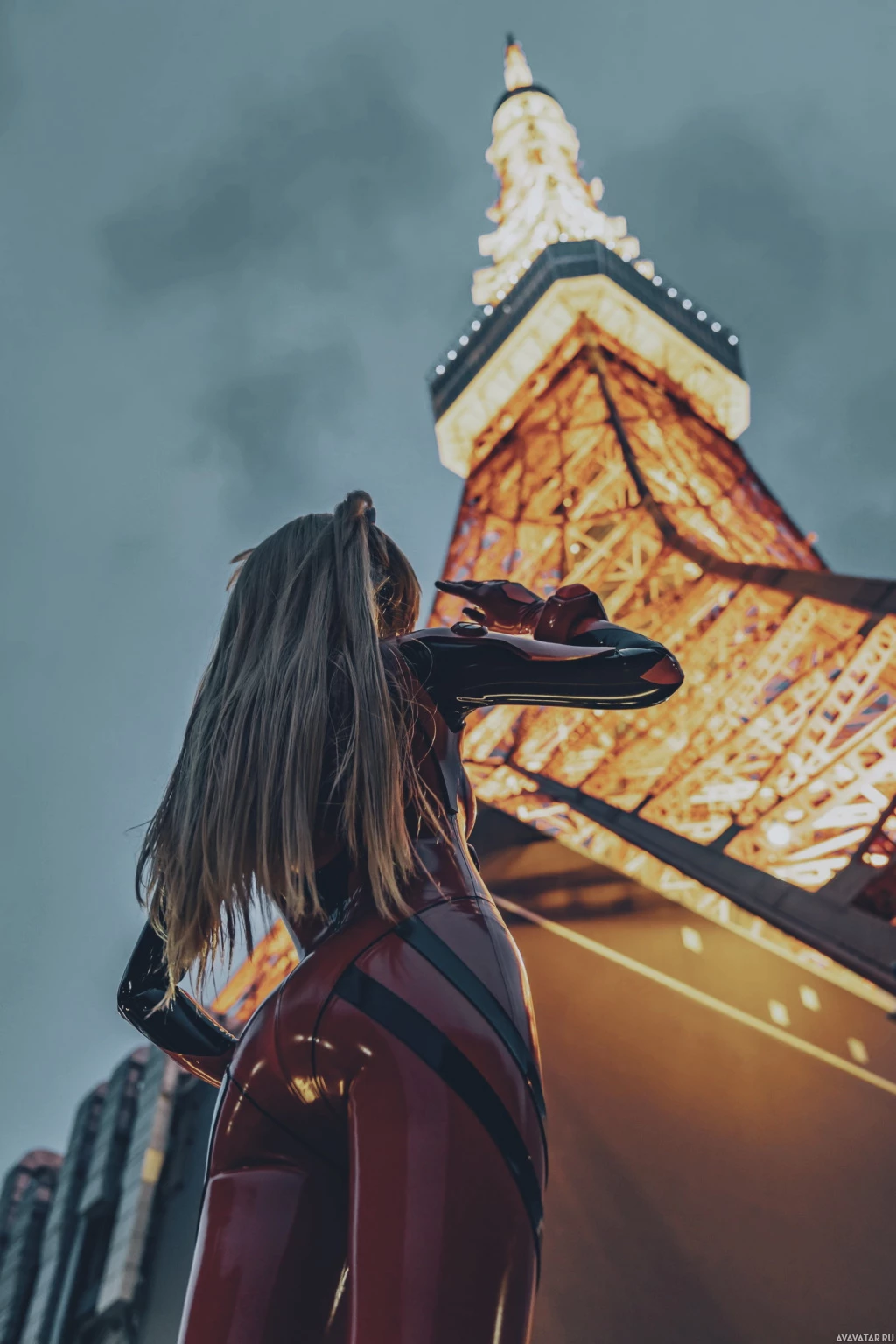 Asuka Langley from the anime "Neon Genesis Evangelion." The individual is facing away from the camera, looking towards a towering structure that appears to be