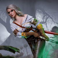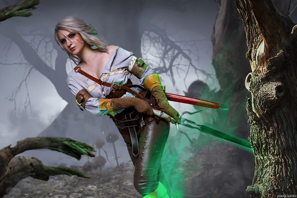 the video game "The Witcher 3: Wild Hunt." She is depicted in her battle outfit, complete with armor and weapons that are characteristic of her character's