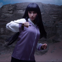 The image features a person cosplaying as a character. The cosplayer is depicted in