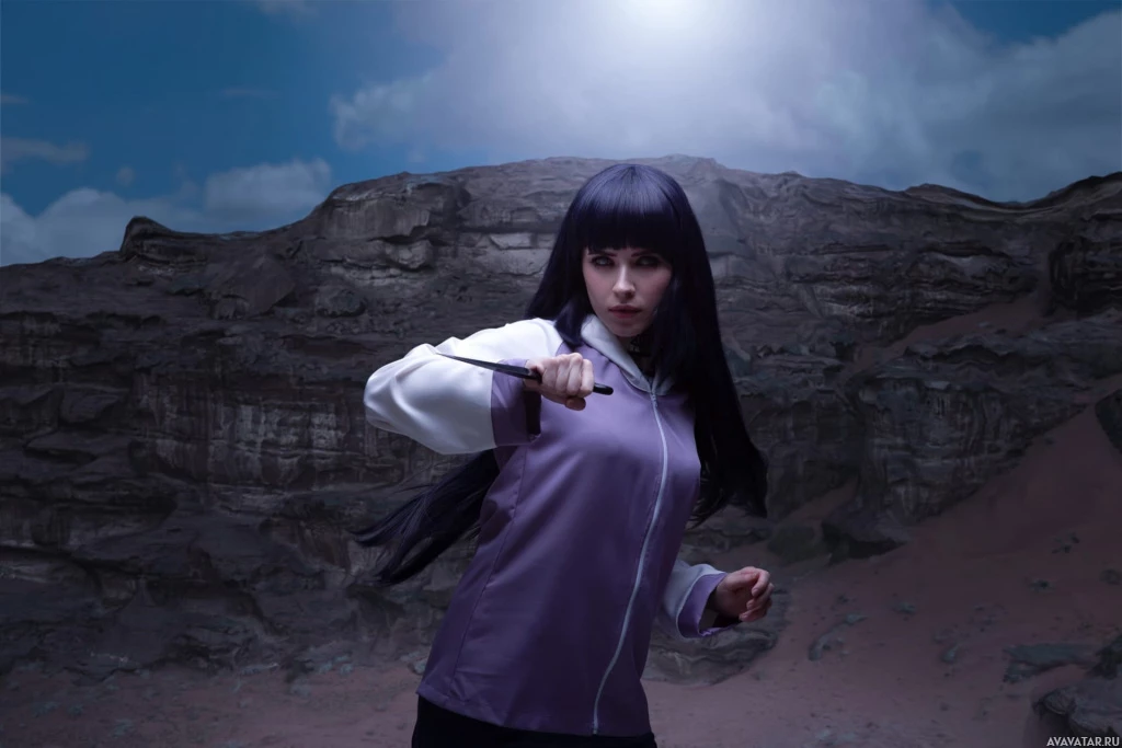 a purple outfit that appears to be a costume inspired by a certain style or character. The background suggests an otherworldly environment, possibly resembling a desert or