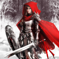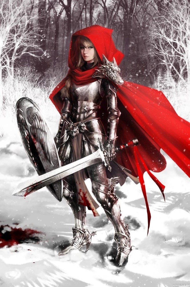 a red cloak draped over it, and she has a sword strapped across her chest. Her helmet is not visible, so her face and hair are visible. The background suggests a wintery, possibly