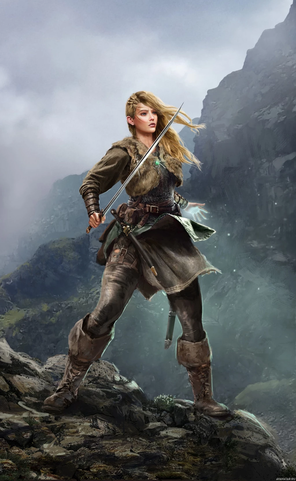 На картинке изображена героиня женского пола с мечом в руках. Судя по ее одежде и окружающей обстановке, она находится в фантастическом или приключенческом мире, возможно, в средневековом или фэнтезийно-тематическом мире.