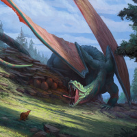 a reclined position with its head and neck extended forward. There's a character on the right side, possibly interacting or observing the dragons. The setting appears to be a forest-like