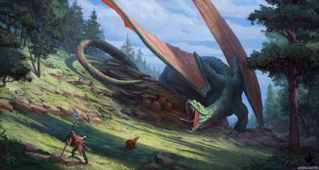 a fantasy scene with two dragons. One dragon is standing on the left side, while the other is in