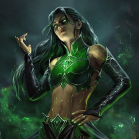 dark hair and is holding a staff with green energy flowing from it into her hands. Her outfit includes a top with a visible emblem that could suggest