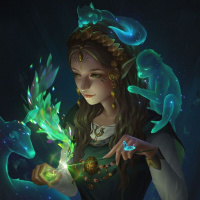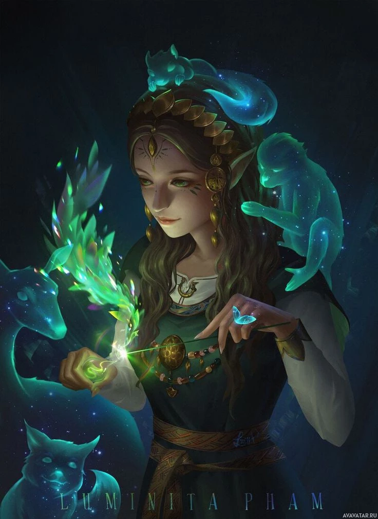 intricate designs, which adds to her ethereal appearance. She appears to be casting a spell or performing an enchantment, as evidenced by the sparkling