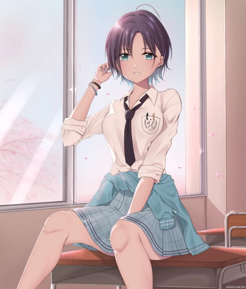 На картинке изображен анимационный персонаж, девочка с фиолетовыми волосами, одетая в школьную форму. Она сидит на скамейке в помещении и смотрит в окно, через которое проникает мягкий свет. На окне частично опущены жалюзи. Ее поза и выражение лица говорят о том, что она, возможно, о чем-то размышляет или мечтает наяву.