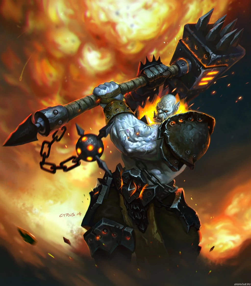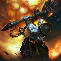 a large hammer in one hand and chain link in the other. He appears to be in motion, possibly charging forward with the explosion behind him adding to