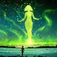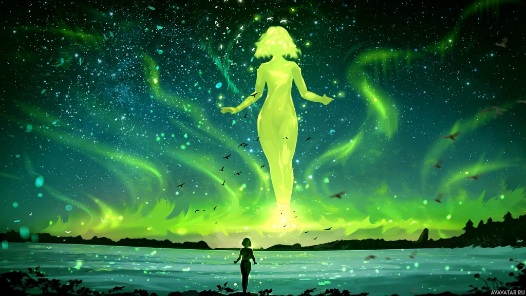 a silhouette of a girl standing on a shore with a vast expanse of water in front of her. In the distance, there is an illuminated figure that appears to be a humanoid shape emitting light and surrounded by greenish-