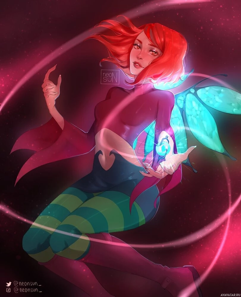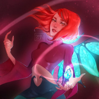 red hair, wearing what appears to be a fantasy-themed outfit consisting of a bodysuit with wings attached to the back. The character is holding a staff in one hand and a crystal or gemstone in the other, suggesting they might have magical abilities or are part of