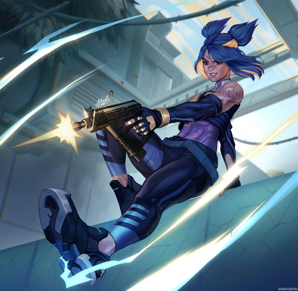 a young girl with blue hair, wearing a futuristic outfit consisting of a purple and black bodysuit. She has a prominent weapon in her hand, which looks like a high-