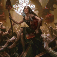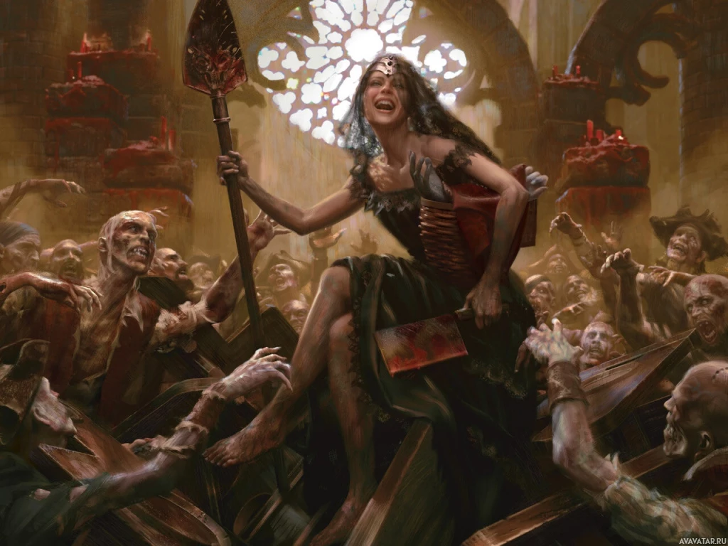 stained glass windows and a large crucifix in the background, which adds to the macabre atmosphere of the scene. The woman is holding what appears to be a staff or weapon, further emphasizing her position as someone in control amidst the chaos around her. The zombies have