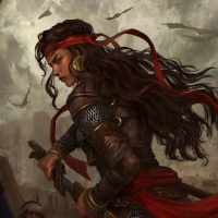 a female character, likely from a fantasy or historical setting. She is holding a sword and appears to be in action or battle. The character has